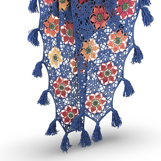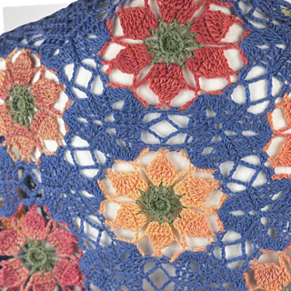 The High Noon Shawl is my version of the classic shawl with lace and flowers. I used the very soft and warm merino wool yarn Scheepjes Unity, which comes in both solid and variegated colors. I used the color 963 Haak Maar Raak to make my flowers, and the variegated yarn made all the flowers a little different. As main color (background) I used the vivid blue color 883 Rineke, and for the flower centers I used the soft green color 879 Kristina.