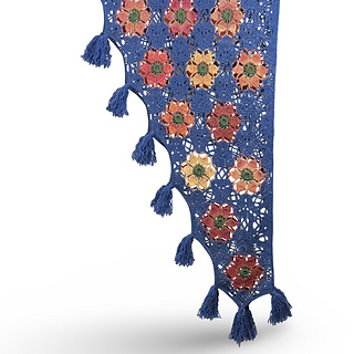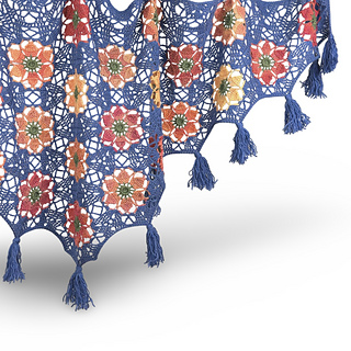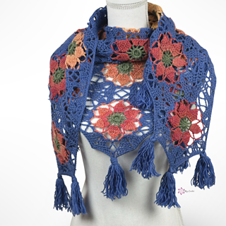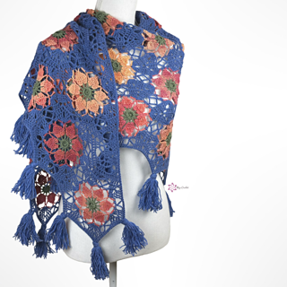 The shawl is made of 28 flower hexagons and 6 half hexagons. First you crochet the flower hexagons that you join as you go when crocheting the last row (described in the pattern). Then you crochet the half hexagons and join them as you go in the same way. No sewing!