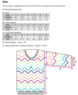 This sweater is intended to be worn with 6–8 inches/15–20 cm of positive ease. Select a size which is 6–8 inches/15–20 cm larger than your bust circumference. Measurements below are for the finished sweater after blocking