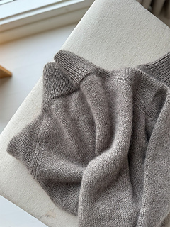The sweater is worked from top to bottom. First stitches are cast on for the neck, which is worked back and forth with increases on both sides to shape the upper back. Then stitches are picked up along the shoulder edge, and the shoulders are worked individually back and forth – first with short rows and then with increases for the neck. The front piece and back piece are then joined for the body which is worked in the round. The neck stitches are picked up along the neck opening and the neckband is worked in the round in ribbing. Sleeve stitches are picked up around the armhole, and sleeves are worked individually in the round with decreases along the ribbing panel and are then finished with a ribbing edge and Italian bind off.