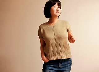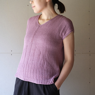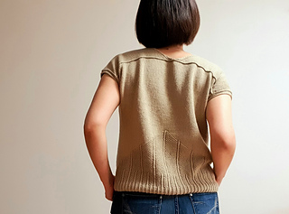 後ろ身頃上部のI-Cordから編み始め, トップダウンで編むプルオーバー . Vネックの襟ぐり, 肩, 後ろ身頃を形作るため, I-Cordの両サイドでGerman Short Rowを行う. 身頃と袖の目を分けたあと, 脇下からは前後身頃を輪で編む. ねじり目リブとかのこ編みの模様編み部分はチャートを参照して編 む. 袖ぐりはマジックループか4本棒針を使用しI-Cord Bind-Offを行う.