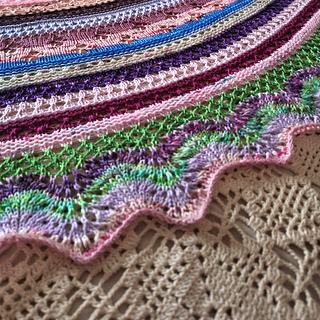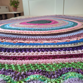 Hilda is a large round blanket, and it is knitted with fingering weight yarn. The pattern is easy to
