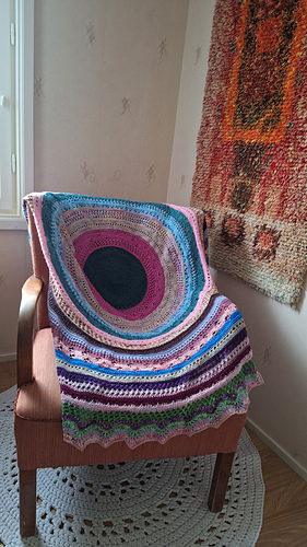 Peitto on pyöreä ja sen halkaisija on noin 170 cm. Hilda on suunniteltu 24 minivyyhdille, mutta voit aivan hyvin tehdä peiton myös muista langoista: käytä tähän projektiin lankakoreistasi löytyviä jämälankoja tai käytä isoja, täysiä vyyhtejä.