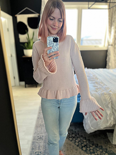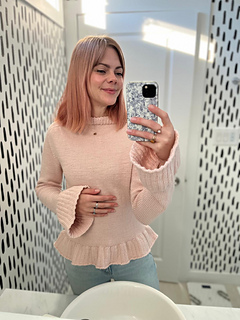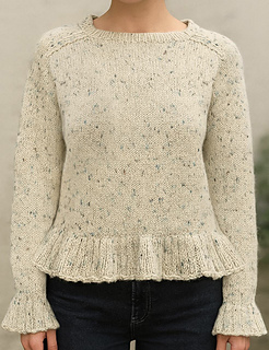 Knitted jumper with ruffels in flat rib. The work is knitted from the top down with a saddle shoulder and ruffles decorating the sleeves.