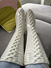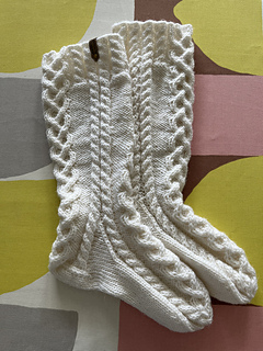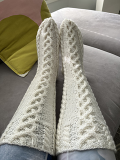Kauniit sivupalmikot koristavat näiden sukkien varsia ylhäältä alas aina sukkien kärkeen asti. Edessä on kaunis aran-henkinen palmikkokuvio. Sama palmikkokuvio toistuu myös pohkeen puolella.