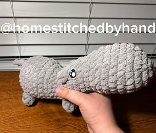 On a 3.5mm hook: 5 inches long. 2 inches tall using Ricorumi Nilla Nilla