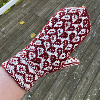 En vante i klassisk form. Motivet ser först ut som vingar, men en närmare titt ger att det faktiskt är en massa hjärtan. En hjärtans fröjd är vad det är.