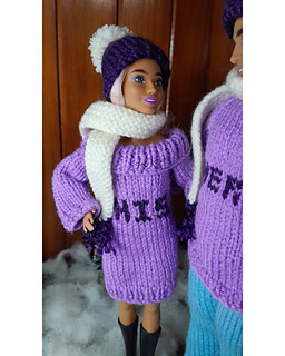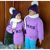 His and Hers set consisting of a sweater dress, beanie and scarf for her, sweater, beanie and scarf for him. On the front is the words His and hers.