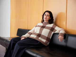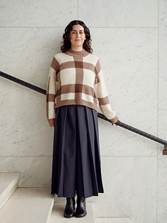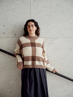 Hojicha is an intarsia-made-easy pullover knitted flat from the top down. The colourwork creates a checked pattern on the body and sleeves. It was inspired by the tartan and check fabrics that Camille Romano likes. The name comes from the colours of one of her favourite teas — hojicha, which is a type of Japanese green tea, roasted in a porcelain pot over charcoal, which becomes a perfect light golden-brown colour.