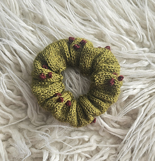 The pattern contains instructions for Holly Berries as well as Snowflakes scrunchies. They are knitted in the round (a provisional cast-on is used to cast on).