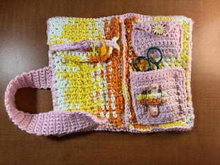 The Hook and Notions Case is the ultimate friend to any crafter- it can easily store crochet hooks, stitch markers, scissors, needles, measuring tape, and any other notions in this compact case. Finished case is 4.5” x 7” closed, and 9” x 7” open.