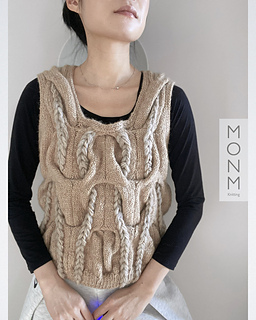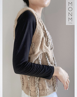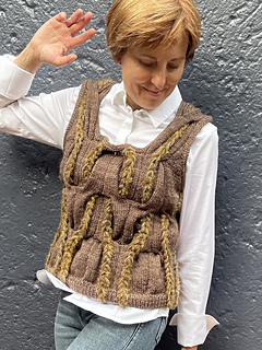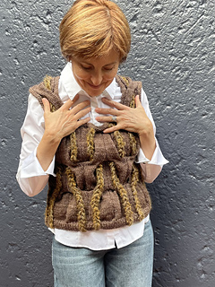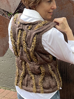 Horseshoe vest is worked from top down in horseshoe cable stitch in one piece.