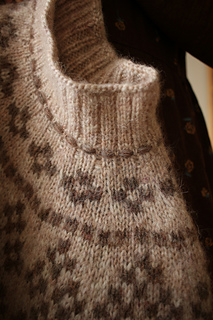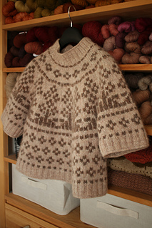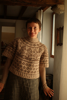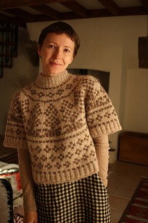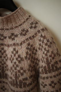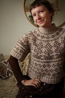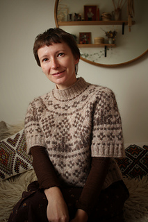 Knit top-down in the round, this round-yoke sweater features stranded colourwork on the yoke, body, and half-sleeves. The mock neck is optional and can be worked immediately or added as an afterthought. The body is slightly cropped with a gentle A-line shape, and the hem and cuffs are finished with 2×2 ribbing.