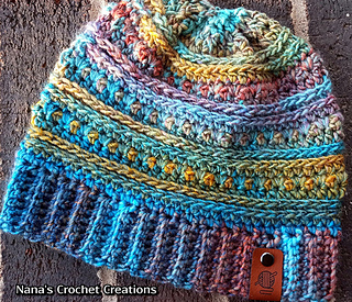 (BOTTOM hats were made using Red Heart Roll With It Melange in “Paparazzi” and “Show Time”. (Yarn was allowed to transition on its own.)
