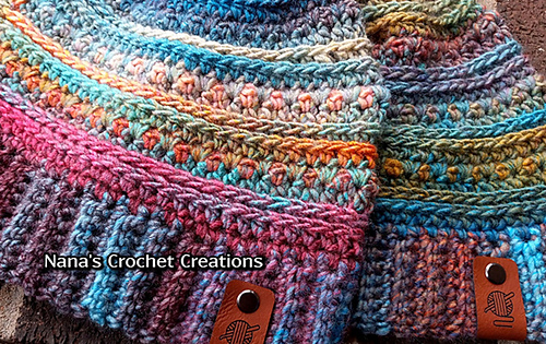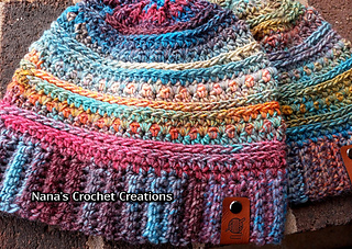 • (Hats were made using Red Heart Roll With It Melange in “Paparazzi” for hats on TOP and “Show Time” for hat on BOTTOM. Yarn was allowed to transition on its own.)