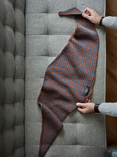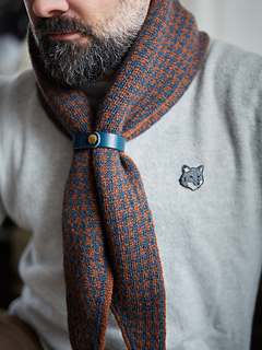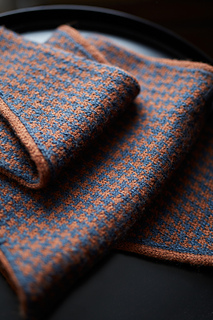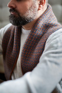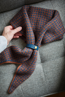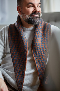 The Huxley scarf features a classic houndstooth motif worked using stranded colourwork. It is knitted in the round, making it fully reversible. Increases are worked to the left of each side, gradually shaping the piece into a distinctive diamond-shaped scarf that drapes elegantly when worn. The Huxley scarf is a graphic yet timeless accessory, both engaging to knit and striking to wear.