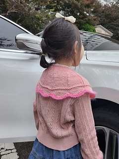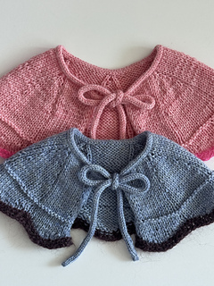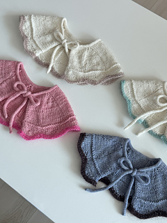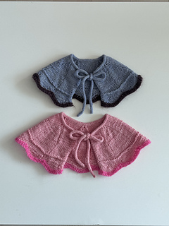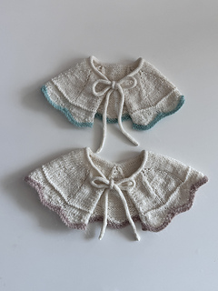 The Ice Cream Collar begins by working the ties first, then picking up stitches and knitting downward. It is sized to fit infants through young children. Not only can it be used as an accessory to complement clothing, but it also provides warmth around the neck and shoulders, making it suitable as a functional winter garment.