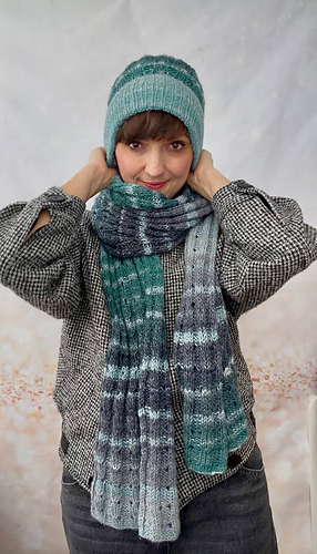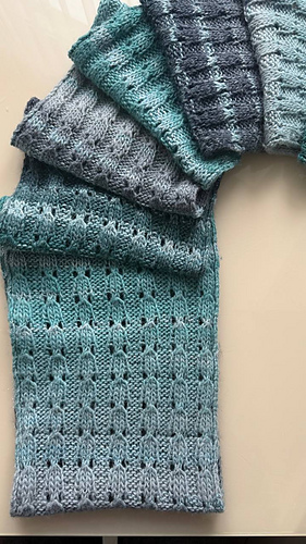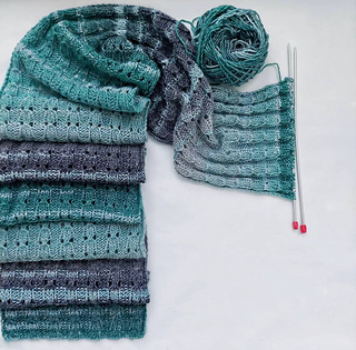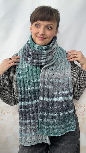 The scarf is worked flat in rows. The stitch pattern repeats vertically, allowing you to easily customize both length and width by adding or removing pattern repeats. This makes the design highly flexible and adaptable to different yarn weights and personal preferences.