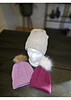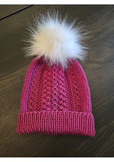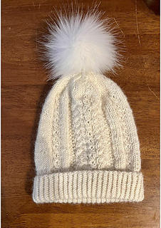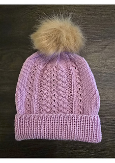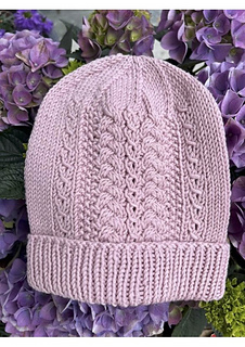Luen har ett flott flettemønster foran på luen og glattstrikk bak.