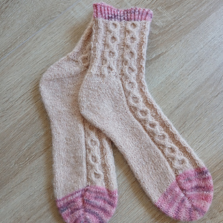 Knitted from the toe up, these socks feature a delicate cable and cross-stitch pattern. The pattern is presented in diagram form for each sock and is very easy to follow and remember.