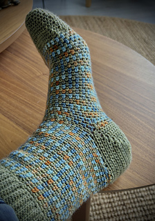 The amount of yarn required also depends mainly on your shoe size. Crocheting socks always requires more yarn than knitting socks, and a good benchmark is that you need one and a half times as much yarn for a crocheted sock as for a knitted sock. However, tests show that for this pattern up to a shoe size 40 (EU), you will need 100 grams of sock wool. Each size above that requires about 110-150 grams of sock wool. It also varies by the length of the leg and toe pieces you choose.
