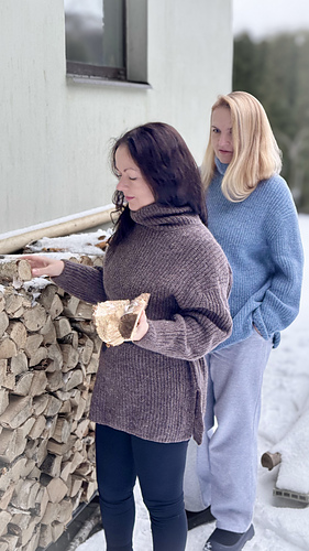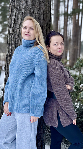 The pullover is worked from the top down with a seamless hybrid shoulder. First, the upper back is knit flat, shaped with increases, and left on hold. Stitches are picked up for the front shoulders, which are worked flat separately. Then the front and back shoulders are joined up to knit the yoke in one, and stitches are picked up along the shoulder edges for the sleeves. When the yoke is complete, the body and sleeves are separated and worked in the round to the bottom. The collar is picked up and worked circularly. The pattern is included in two length versions: regular and long. The extended version features asymmetrical slits along the hem to prevent the hem from stretching during wear.