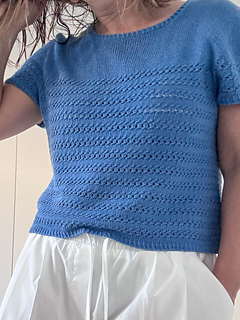 This tee features a delicate lace motif created with yarn overs and small cable stitches.