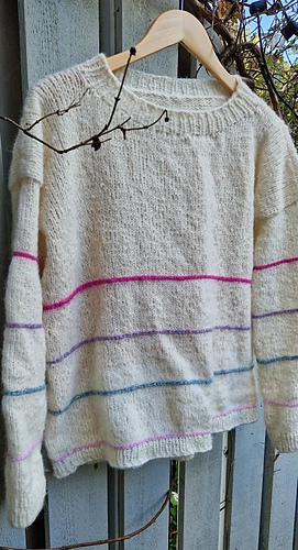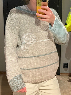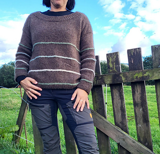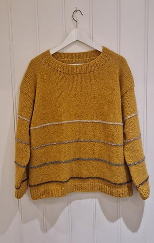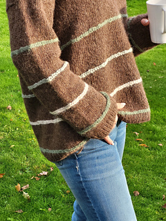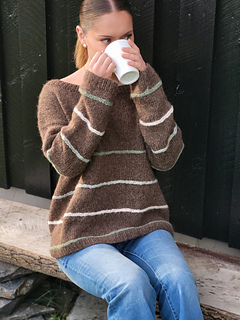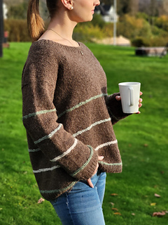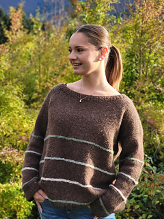 In the woods sweater is worked from the top down. First, the upper part of the back piece is worked back and forth, then stitches are picked up at the cast-on edge on each side for the front piece. The GSR technique is used to shape the front pieces before increasing for neckline. When the front and back piece are the same length, they are knit together in the round on circular needles. The stripes are knit with horizontal stitches. The idea is that you should be able to use leftovers if you have some lying around. Further, the sleeves are picked up and knit in the round on circular needles. The neckline is knit in the end.
