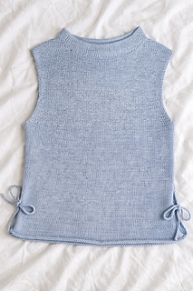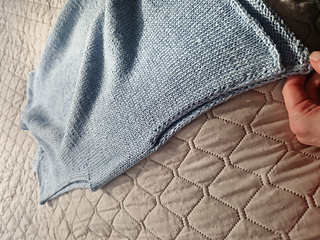 Stitches for the front are picked up from the shoulder stitches. Each front is worked separately, shaping the front neckline while working down to the armhole. The front and back are then joined at the underarm, and the body is worked in the round to the desired length.