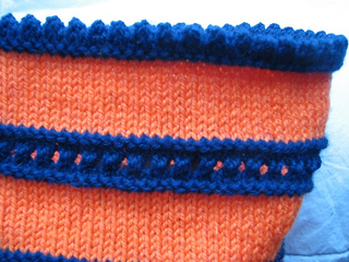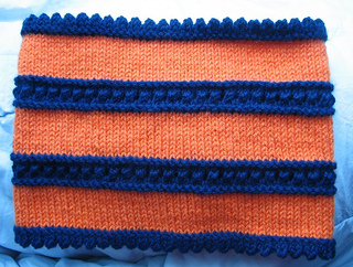 I designed this cowl to show off our school’s team colors. I bought a skein of each color and made two cowls (reversing the colors in the second one), and still had a little yarn left over. The yardage given above is for one cowl.