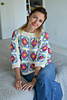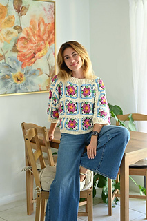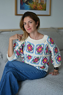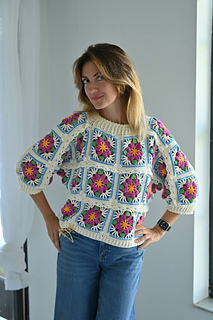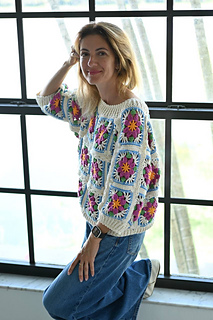 Built from detailed square motifs with raised flower centers, soft blue framing, and creamy textured borders, this sweater creates a beautiful contrast between structure and softness. The relaxed fit, ribbed neckline, cuffs, and hem give it a polished finish while keeping it comfortable and easy to wear.