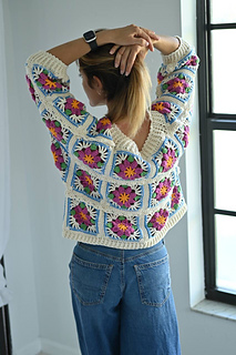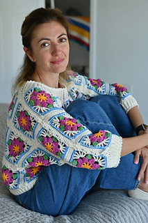 The Infinity Sweater is a true statement piece — perfect for layering in spring or autumn, pairing with jeans, or adding personality to a simple outfit. The floral granny square motif gives it depth and dimension, while the structured joining keeps everything clean and modern.