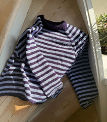 Den blå og lilla Ingeborg Sweater er strikket i ANYDAY Merry fra Mayflower, i farven Mørk Mørkelilla 26 og Lyseblå 21.
