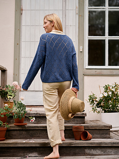 The sweater is worked in the round from the 1 x 1 Rib hem upwards for a continuous flow of the Diamond Lace Pattern. Front and back are then worked flat separately, with short rows to shape the shoulders. Sleeves are picked up and worked in the round in the lace pattern, with a faux seam and shaping, down to 1 x 1 Rib and a neat Tubular BO. The neckband is worked in the same way.