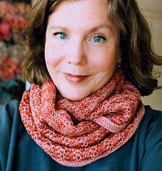 The Intertwined Loop is a long cowl or infinity scarf worked in the round in two contrasting colors in a fun-to-knit interlaced stitch pattern. Long enough to wear singled, doubled, or wrapped and tucked, this versatile accessory is built to suit any wardrobe or weather need. Like its larger cousin, the Intertwined Wrap, this piece is an exploration in organic pooling. The accent color, provided by the quarter-dyed skein Apricity, closely matches the main color, Adored. This results in subtle horizontal striations that contrast beautifully with the vertical grain of the interlaced stripe pattern.