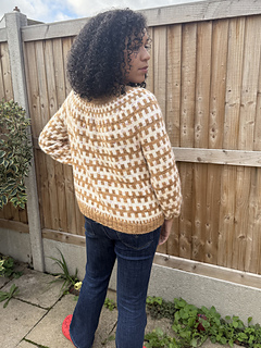 The brown and white long sleeve sweater, with cuffed sleeves, is a size 4 - with 17cm of positive ease