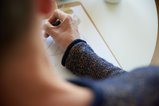 The sweater is worked top down from the inside using stockinette stitch, raglan increases and German short rows. The garment will be turned inside out at the very end so the purled “introvert“ version stays a secret until it’s finished.