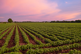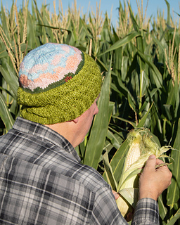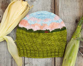 This design uses a fun and easy stitch pattern to depict diagonal rows of crops at sunrise. An optional farmhouse and silo are seen in the distance.