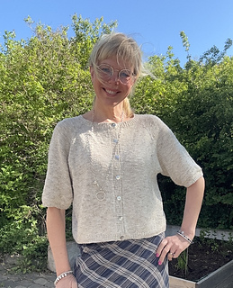Short-sleeved cardigan with raglan sleeves, knitted top down. Easy to knit with clear instructions, making the cardigan suitable even if you have never knitted top down before. In the photos, the beige is knitted without short rows, but if you want a deeper neckline at the front, instructions are included for shaping the neck using so-called German short rows (the lilac). The beige cardigan is knitted in Permin Iris and the light lilac in Permin Sally.