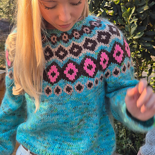 Irma ist ein leichter und farbenfroher Pullover, von oben nach unten mit eingestrickter Musterpasse gearbeitet.