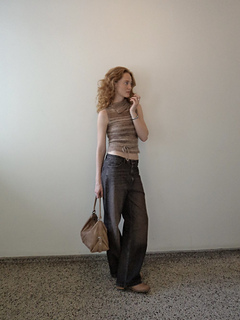The Isa vest is worked from the top down. First, the front piece is knitted, followed by the back piece. The two pieces are joined to knit the rest of the body, finishing with a ribbed edge at the bottom. Then, the shoulders are sewn together, stitches are picked up for the neckband, and finally stitches are picked up for the ribbed detail around the armholes.