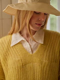 Isabell is an ultralight, relaxed, V-neck brioche sweater to wear on a chilly summer day or night. Throw it over a swimsuit or a summer dress to give some extra warmth. Using single strand of silk-mohair yarn makes this garment weigh almost nothing! The inspiration for Isabell came from the yarn: Sara Markkula wanted to experiment with the texture that results from using a single strand of silk-mohair for brioche stitches. The squishy, fluffy but airy net-like texture felt a perfect combination for a summer garment. The garment’s name is based on one of her beloved relatives; Sara tends to name her designs after her family tree.
