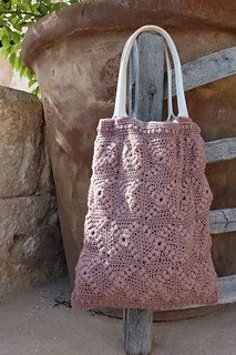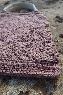 Construction: The main body of the bag is worked in crocheted squares that are blocked and then joined together to make a tube before the base and top are added in rounds.