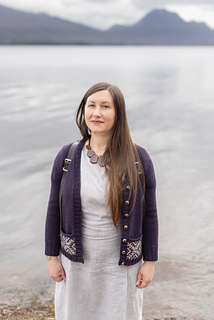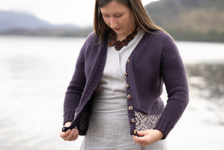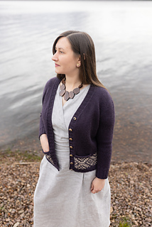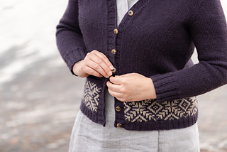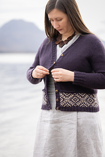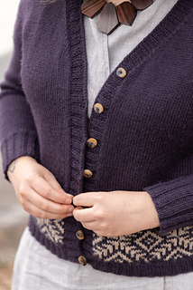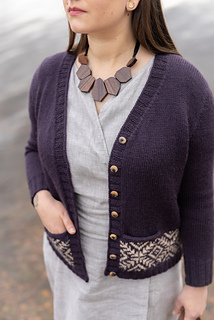 This cardigan begins by knitting two pocket linings. The body is then cast on and joined for working in the round, with a steek; and a colourwork band is worked, before joining the two pocket linings to the top of the band, and binding off the front steek stitches to continue working the remainder of the garment back and forth. Armscyes are shaped, then fronts and back are divided to be worked separately, shaping the front neck with decreases. The shoulders are joined and two sleeves are picked up, around each armscye, and worked top-down, with short rows shaping the upper sleeve cap for a tailored, set-in fit. A ribbed band is then picked up around the front openings and completed with i-cord bind-off, into which buttonholes are inserted. The pockets are stitched in place and i-cord completes the pocket tops. After casting on, steek stitches are not included in running stitch counts.
