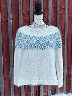 Tröjan stickas i enkelt garn på stickor 5 för en luftig och värmande tröja som passar fint som mellanlager kalla dagar på fjället.