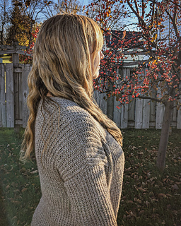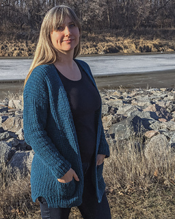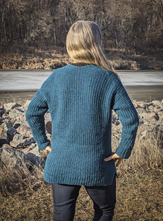 required. The simple button band is worked with the body. The drop shoulder construction creates a sweater that fits well on the shoulders without sliding down. Instructions are included for optional afterthought pockets.