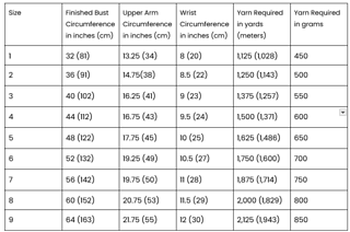 There are 9 size options available, with a finished bust circumference ranging from 32 to 64 inches (81 to 163 cm). It is designed to be worn with 1 to 3 inches (2.5 to 7.5 cm) of positive ease.