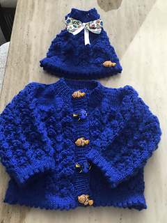This s a Baby Knitting Pattern for a cardigan and a pineapple style hat. It will fit a baby18’’-20”chest using DK yarn. You will need 200g of DK yarn to make the set.