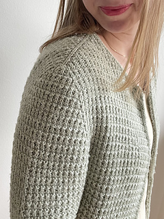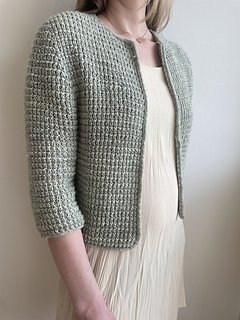 Jackie Jacket Light, like its namesake, features a broken rib pattern that gives it structure. When knitted in the original yarn or a similar alternative, the light version becomes soft and drapes beautifully on the body. The design has a regular amount of positive ease and is short in both overall length and sleeve length, making it perfect over a summer dress or top – or worn as a standalone blouse.