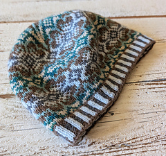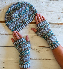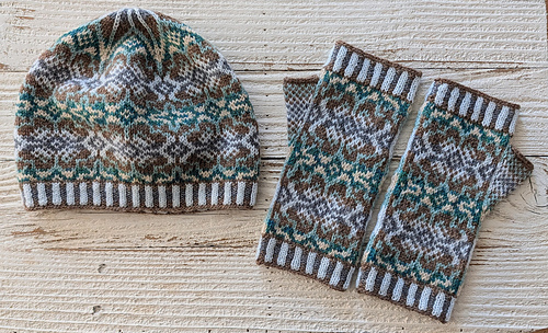 The Jacobina Hat is a part of the Jacobina Set, a knitting pattern for Fair Isle style accessories. The pattern is an “ebook” and also comes with instructions for the fingerless mitts.